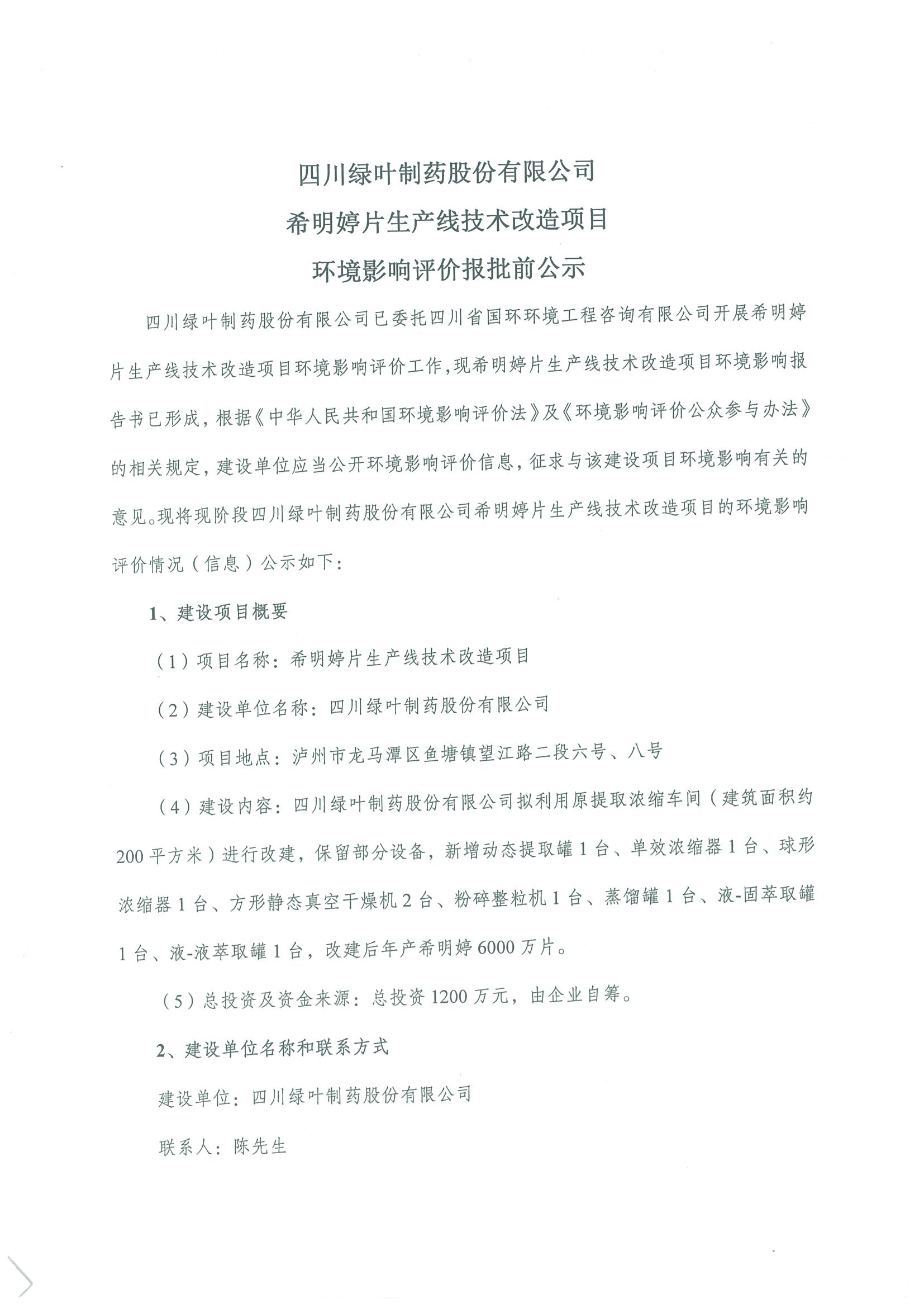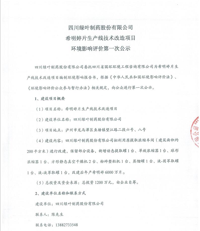 四川綠葉制藥股份有限公司希明婷片生產線技術改造項目環境影響評價第一次公示